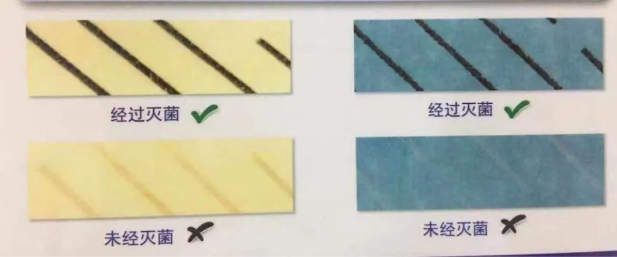 Обычно используемым элементом в лабораториях является 3 -метровая индикаторная лента автоклаве, которая изменяет цвет после стерилизации. Лента изготовлена из термочувствительных химикатов, разработчиков цвета и материалов для краски, напечатанных на полосовой узоре на клейкой ленте. Он применяется непосредственно к внешней стороне пакета стерилизации, с минимальной длиной 5 см. Слегка нажмите кнопку, чтобы обеспечить хорошую адгезию и герметику. После воздействия на 121 ° C в течение 20 минут или 130 ° C в течение 4 минут диагональные белые полосы на ленте должны стать полностью черными. Если изменение цвета неровно или неполное, пакет считается неправильно стерилизованным.